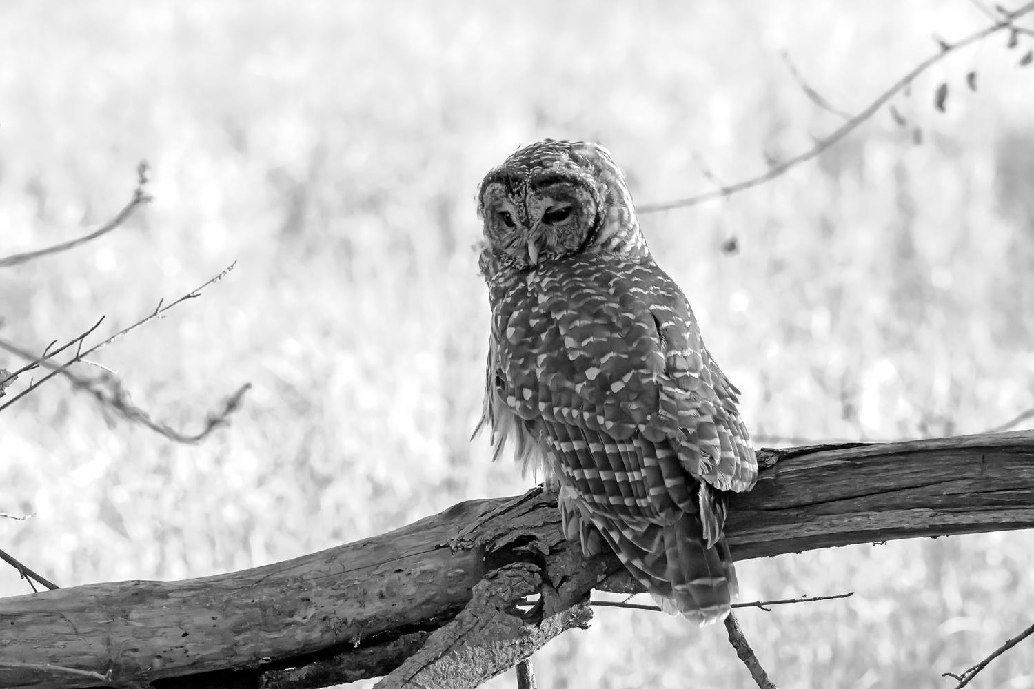 Barred Owl Before the Hunt 1, black and white