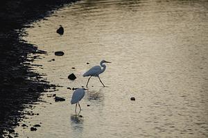 Great egrets Strolling Through the Lake at Dawn