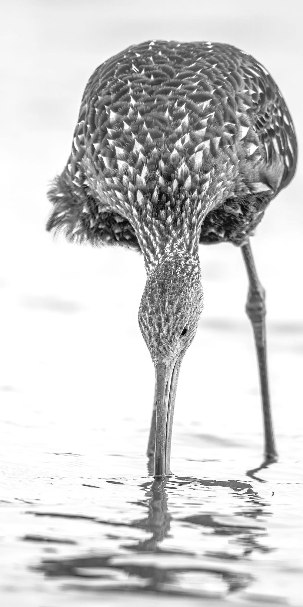 Limpkin Hunting Clams and Snails in Shallow Pond 2, black and white