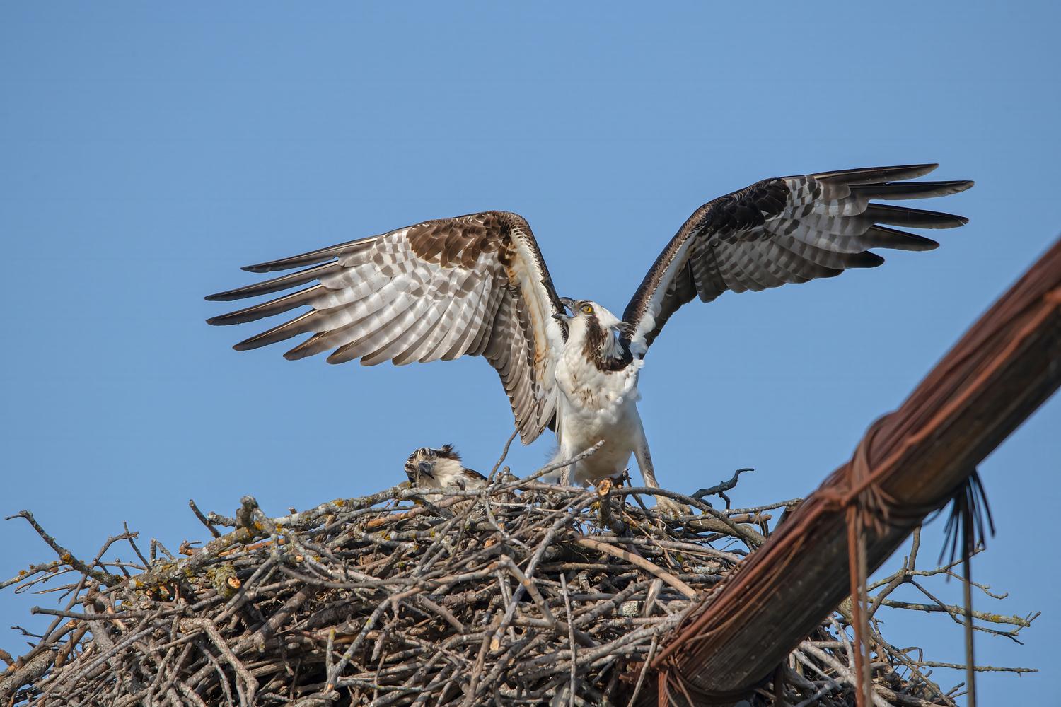 Male Osprey Renovating Nest While Female Stays Out of the Way