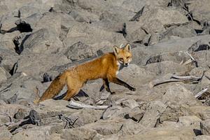 Photographed at Perry Lake, Kansas. Close-up of red fox roaming the rocks below the dam, near the lake.