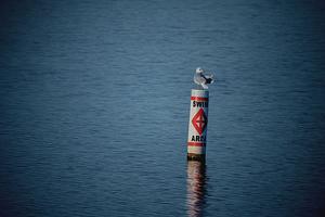 Ring-Billed Gull Standing on Swimming Sign at the Lake