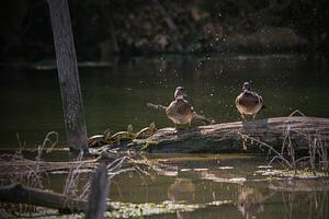 Wood Duck Pair on a Log After Male Shakes off Water